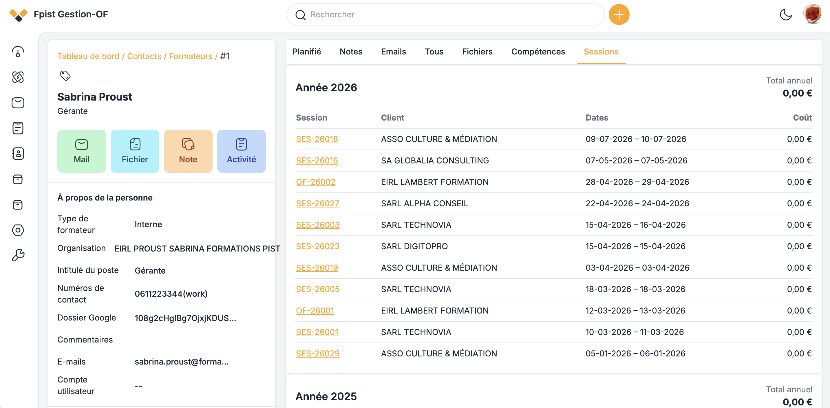 Depuis la fiche Contact > Formateur> Vue, onglet Sessions, vous accédez à la liste des formations animées par le formateur.